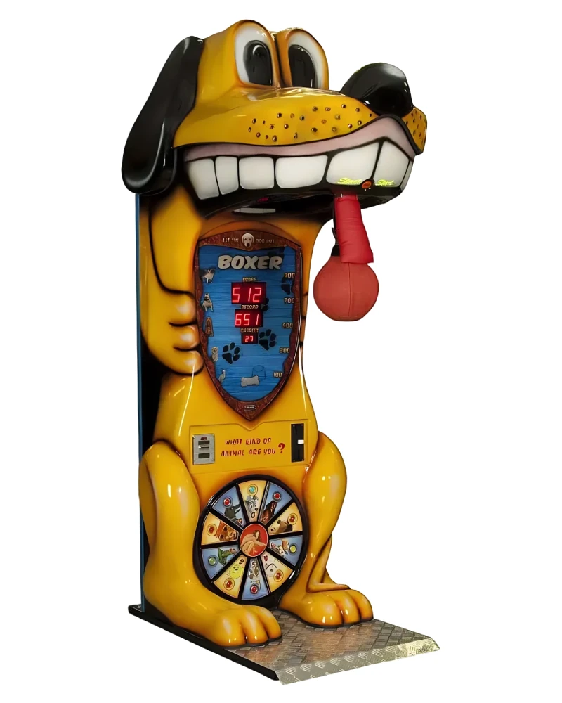 Dog is a boxer machine that measures up strength of the punch. This strength tester has a fun cabinet with a dog design. The machine is made to be used indoor and outdoor in amusement parks, fairs, pubs, cinemas, etc. It attracts customers with coloured LEDs and interesting animal sounds.