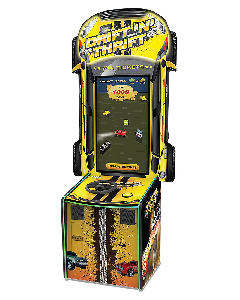 Test your drifting skills in this adrenaline-pumping, action-packed car drifting redemption game that features a realistic steering controller and appeals to all ages. Drift away from cops in this fast-paced car chase, and collect $1000k in gold & cash to WIN BONUS TICKETS! Drift ‘N’ Thrift features an attractive cabinet with a 43″ HD screen.