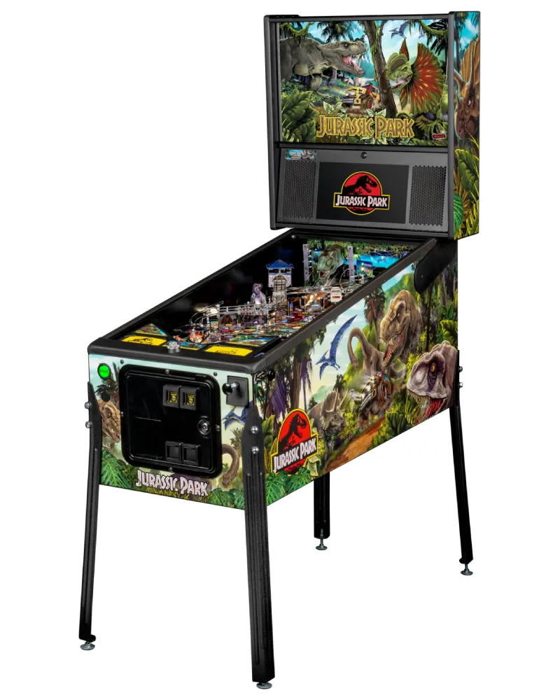 Like the blockbuster movie, the Jurassic Park pinball experience generates heart pounding excitement as the player progresses through the game. As the game starts, the player is transported to Isla Nublar, an amusement park where escaped dinosaurs are running amok! The player’s mission is to rescue park staff and recapture dinosaurs from the chaotic environment unleashed by Dennis Nedry’s computer virus. All dinosaurs, however, are not created equal as players will battle Raptors and the mighty T. Rex! The game immerses players in the fun world of battling dinosaurs in an action-packed adventure filled with twists and turns.The Premium and Limited Edition models feature an amazing animatronic ball-eating, ball-throwing T. Rex that interacts with the ball and the player. These models also include an interactive Raptor and Raptor Pen featuring a ball-lock mechanism guarded by a motorized gate. The action does not let up with unique mosquito-in-amber pop bumpers and a custom metal horizontal helicopter spinner.“Jurassic Park is a classic film featuring what everyone loves – dinosaurs! The game is designed to be easy to play, but difficult to master,” said Gary Stern, Chairman and CEO of Stern Pinball, Inc.The Pro, Premium, and Limited Edition models also feature a Jungle Adventure Vehicle target in the middle of the playfield that is a spinning Newton Ball. This kinetic target registers direct hits, determines the direction players navigate on the island during gameplay, and lights T. Rex modes. All models include three full sized flippers, four custom ramps, a spinning “Spitter” target, in-lane up/down lock post that sets up critical playfield shots and distinctive hand-drawn art highlighting iconic dinosaurs from the series.
