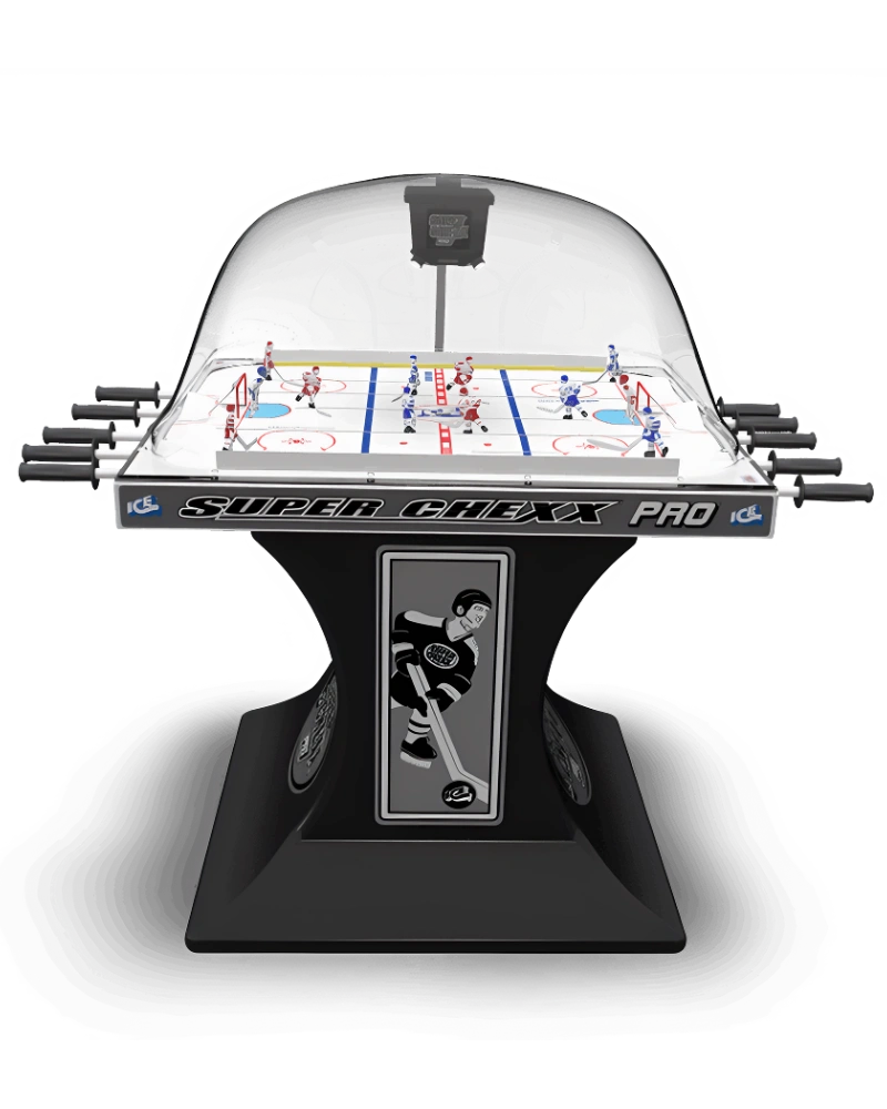 Super Chexx Pro bubble hockeywith new electronics, 5 LCD Jumbotron, animated videos, live-action game calls, with LED lighting. With strong fiberglass, smooth surface material and a durable polyethylene base, this Bubble Hockey game offers unmatched game play for years to come.